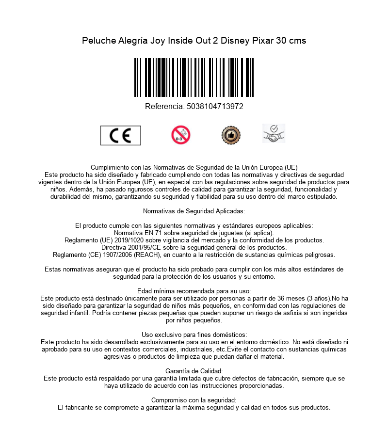 Alegría, de "Inside Out," es un personaje vibrante y amarillo que personifica la felicidad. Optimista y enérgica, se esfuerza por mantener a Riley positiva y feliz, liderando las emociones con un entusiasmo contagioso. Aunque a veces subestima el valor de otras emociones, su actitud alentadora y su enfoque en el bienestar son esenciales para la resiliencia y la alegría de Riley. Este peluche de unos 30 cms de altura, está hecho de suaves fibras de poliéster y tiene licencia oficial Disney Pixar, los dos legendarios estudios responsables de esta saga de películas.