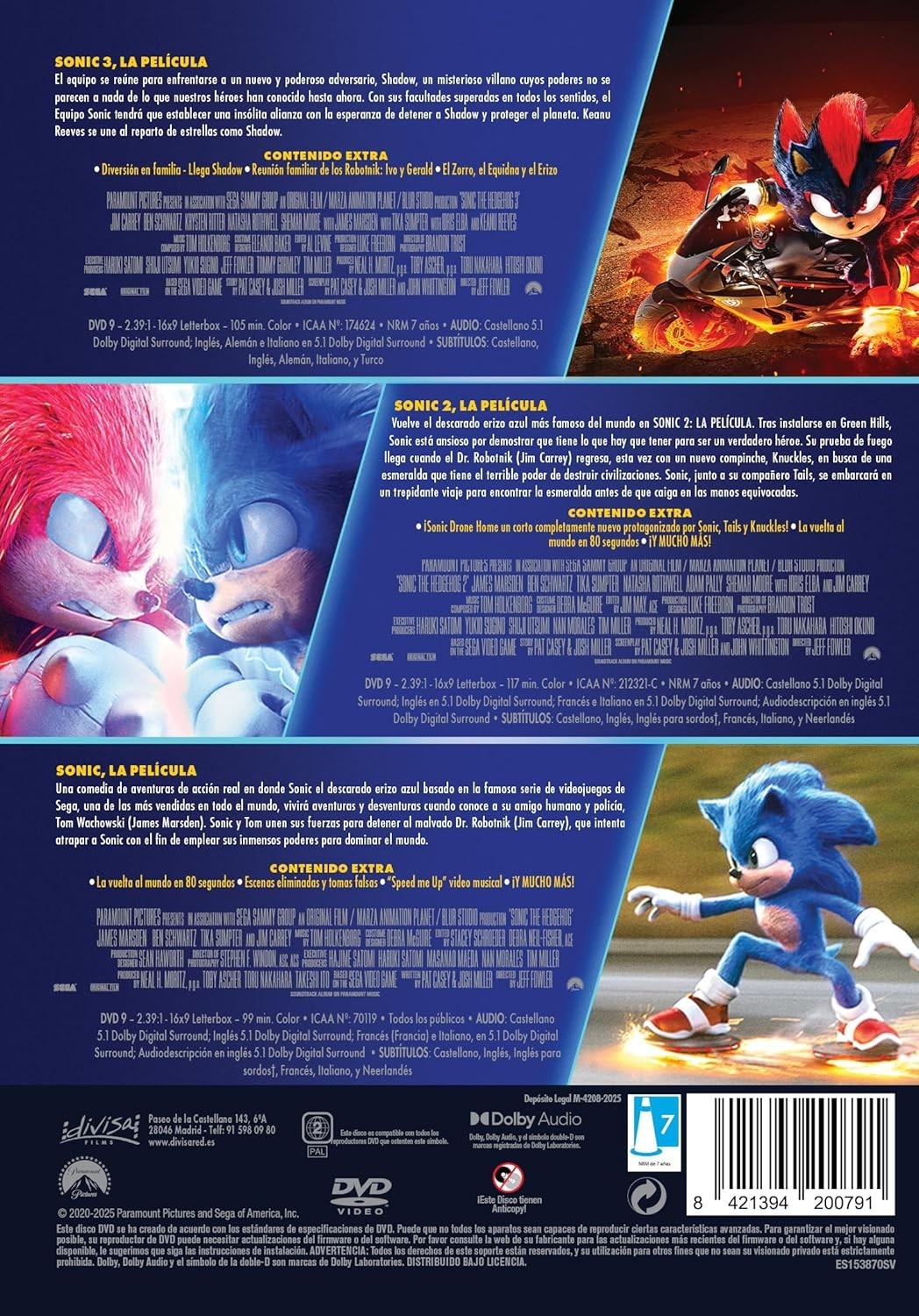 Sonic, el descarado erizo azul basado en la famosa serie de videojuegos de Sega, vivirá aventuras y desventuras cuando conoce a su amigo humano y policía, Tom Wachowski (James Marsden). Sonic y Tom unirán sus fuerzas para tratar de detener los planes del malvado Dr. Robotnik (Jim Carrey), que intenta atrapar a Sonic con el fin de emplear sus inmensos poderes para dominar el mundo. ,Después de establecerse en Green Hills, Sonic se muere por demostrar que tiene madera de auténtico héroe. La prueba de fuego llega con el retorno del malvado Robotnik, en esta ocasión con un nuevo compinche, Knuckles, en busca de una esmeralda que tiene el poder de destruir civilizaciones. Sonic forma equipo con su propio compañero de fatigas, Tails, y juntos se lanzan a una aventura que les llevará por todo el mundo en busca de la preciada piedra para evitar que caiga en manos equivocadas. ,Sonic, Knuckles y Tails se reúnen para enfrentarse a un nuevo y poderoso adversario, Shadow, un misterioso villano cuyos poderes no se parecen a nada de lo que nuestros héroes han conocido hasta ahora. Con sus facultades superadas en todos los sentidos, el Equipo Sonic tendrá que establecer una insólita alianza con la esperanza de detener a Shadow y proteger el planeta.