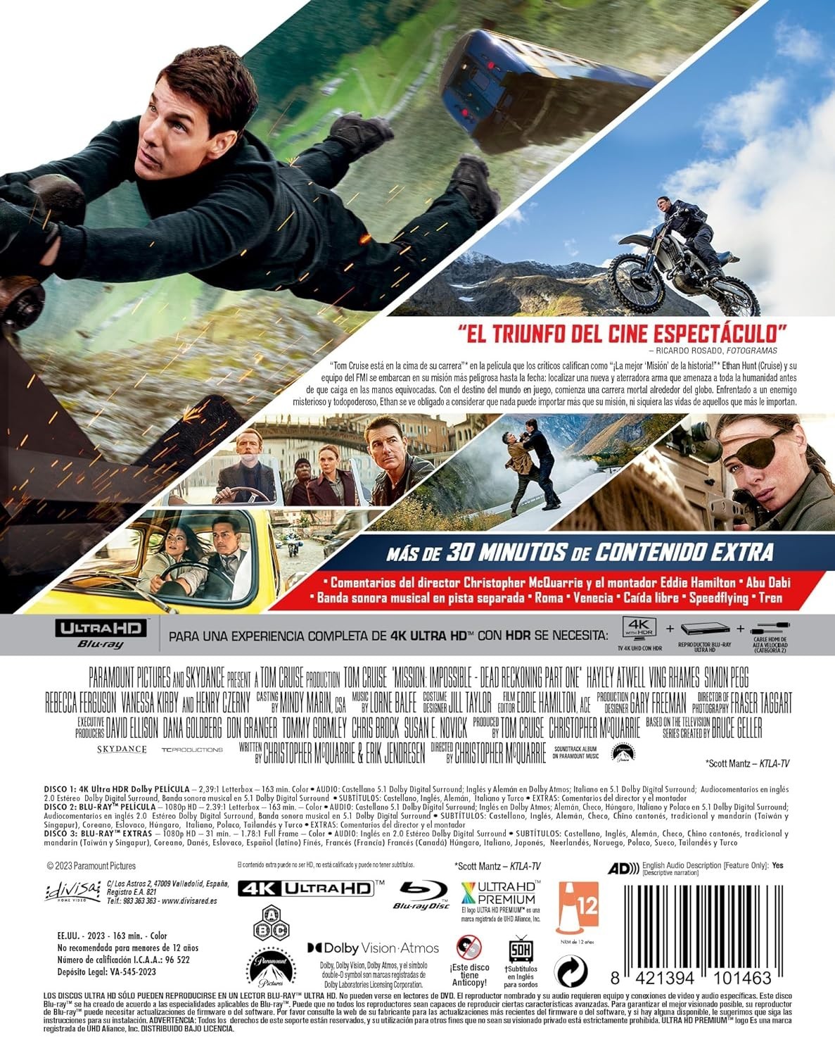 Ethan Hunt (Tom Cruise) and his IMF team embark on their most dangerous mission to date: locate, before it falls into the wrong hands, a terrifying new weapon that threatens all of humanity. In this situation, and with dark forces from Ethan's past lurking, a deadly race begins around the world in which control of the future and the destiny of the planet is at stake. Faced with a mysterious and all-powerful enemy, Ethan is forced to consider that nothing can come before his mission, not even the lives of those he cares about most. Extras: comments from director Christopher McQuarrie and editor Eddie Hamilton. musical soundtrack on separate track, Abu Dhabi, Rome, Venice, Free fall, Speedflying, Train. Image: 2.39:1. Duration: 163 minutes. Disk Region: all regions (A, B, C). Disc 1: 4K Ultra HDR Dolby - 2.39:1 Letterbox – 163 min. Color. Audio: Spanish 5.1 Dolby Digital Surround; English and German in Dolby Atmos; Italian in 5.1 Dolby Digital Surround; audio commentary in English 2.0 Dolby Digital Surround Stereo, musical soundtrack in 5.1 Dolby Digital Surround. Subtitles: Spanish, English, German, Italian and Turkish. Disc 2: Blu-ray 1080p HD – 163 min. – 2.39:1 Letterbox – Color. Audio: Spanish 5.1 Dolby Digital Surround; English in Dolby Atmos; German, Czech, Hungarian, Italian and Polish in 5.1 Dolby Digital Surround; audio commentary in English 2.0 Dolby Digital Surround Stereo, musical soundtrack in 5.1 Dolby Digital Surround. Subtitles: Spanish, English, German, Czech, Cantonese Chinese, Traditional and Mandarin (Taiwan and Singapore), Korean, Slovak, Hungarian, Italian, Polish, Thai and Turkish. Disc 3 EXTRAS: Blu-ray 1080p HD – 31 min. – 1.78:1 Full Frame – Color. Audio: English in 2.0 Dolby Digital Surround Stereo. Subtitles: Spanish, English, German, Czech, Cantonese Chinese, Traditional and Mandarin (Taiwan and Singapore), Korean, Danish, Slovak, Spanish (Latin), Finnish, French (France), French (Canada), Hungarian, Italian, Japanese, Dutch, Norwegian, Polish, Swedish, Thai and Turkish.