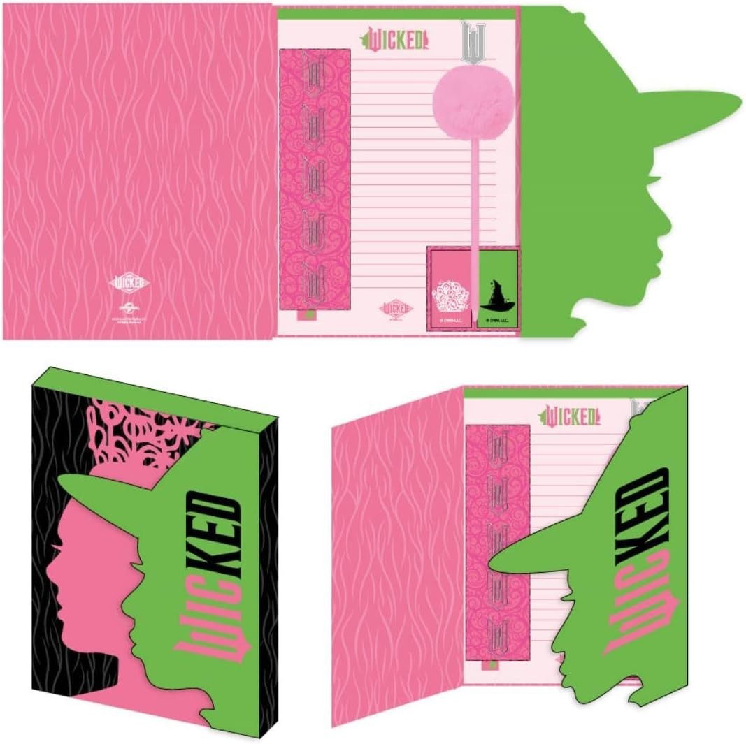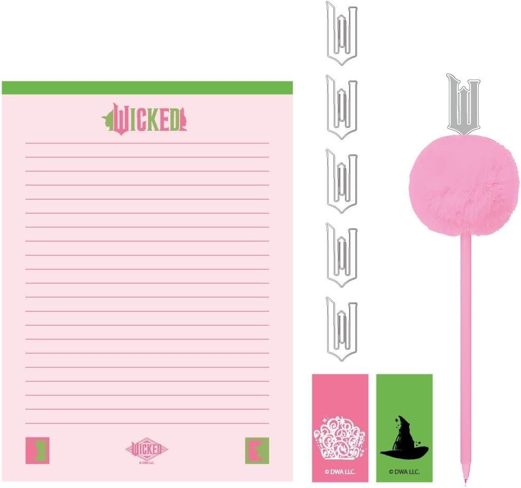 El Set de Papelería Wicked es la forma perfecta de llevar la magia y el estilo del musical a tu día a día. Diseñado para fans que quieren algo más que simples útiles de escritorio, este set convierte cada nota, apunte o tarea en una experiencia llena de encanto. Incluye un bloc de notas en color rosa con elegantes detalles en verde y el logotipo de Wicked, ideal para escribir ideas, listas o pensamientos con un toque distintivo. El bolígrafo, decorado con un divertido pompón en el extremo, aporta un aire desenfadado y original que hará que no pase desapercibido en tu escritorio o estuche. Para completar el conjunto, incorpora clips personalizados en forma de “W”, perfectos para mantener tus documentos organizados con estilo y personalidad. Todo el set se presenta en una sofisticada caja negra con un cuidado diseño de siluetas en rosa y verde, que resalta la estética mágica y teatral de Wicked, convirtiéndolo también en un regalo ideal. Haz que tu papelería refleje tu pasión y añade un toque de fantasía a tu rutina. El Set de Papelería Wicked te está esperando para llenar de magia cada palabra que escribas.