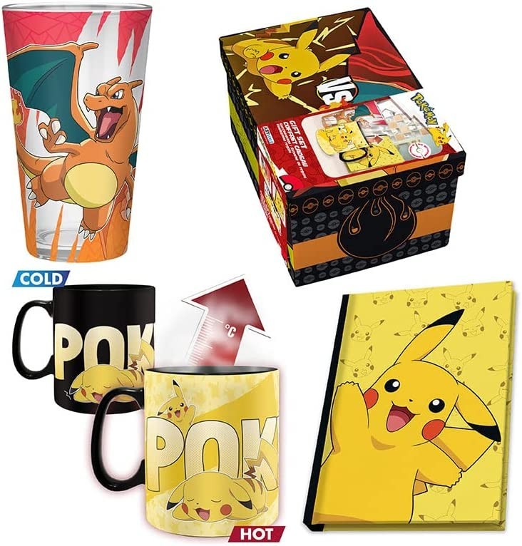 Los fans de Pókemon y los futuros entrenadores están de enhorabuena. Abystyle ha creado una explosiva caja regalo con tres artículos llenos del encanto de estas criaturas. Escribe todas tus notas con el cuaderno con portada de Pikachu, bebe tus bebidas preferidas con el vaso XXL de 400 mls de Charizard o llénate de energía cada mañana bebiendo de la taza térmica que incluye. ¡Cuando eches un líquido caliente en la taza verás como esta cambia de diseño! No son artículos aptos para meter al lavavajillas o al microondas. Todo ello viene en una caja con diseños e ilustraciones de la saga Pokémon, un mundo lleno de aventuras en el que ya han crecido varias generaciones. ¡Hazte con la tuya!
