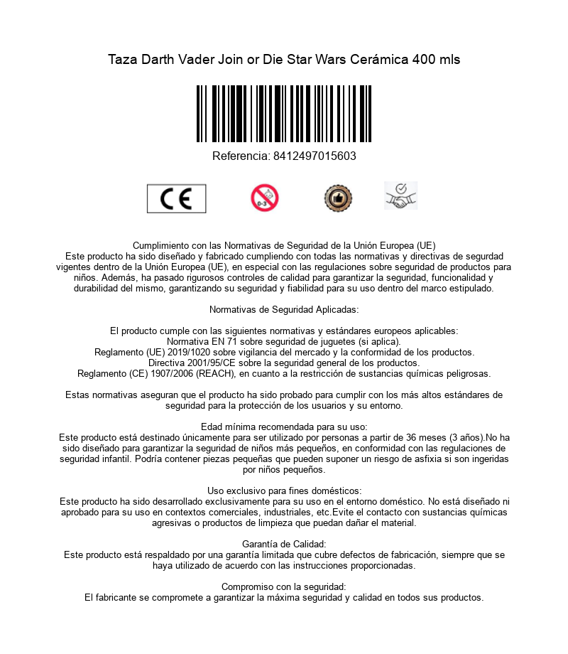 Stor, la marca conocida en toda la galaxia por ser especialista en crear impresionantes tazas temáticas basadas en las sagas y personajes más queridos de la cultura popular, nos trae una salida del mismísimo Imperio galáctico. La ominosa presencia del Lord Sith Darth Vader se siente en cada centímetro de esta oscura taza de licencia oficial en la que además de estar impreso el casco del personaje también están las frases ‘Join or die, it is useless to resist’ y ‘Dark Side’. En la parte de abajo está también el símbolo imperial. Esta impresionante taza está hecha de cerámica de gran calidad y viene en una caja temática de color negro con el logo de Star Wars en blanco. Ándate con ojo, pequeño Padawan, porque esta taza no es apta para lavavajillas ni microondas, haznos caso y mantenla alejada de esas máquinas o acabarás como Anakin al final de su duelo contra Obi Wan en Mustafar...