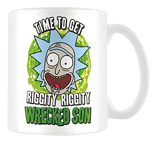 Time to get riggity riggity wrecked son!, eso es lo que pone en la superficie de esta taza de Rick y Morty que Pyramid International nos traen desde una de las dimensiones que visitan este científico y su nieto. Rick es el protagonista absoluto de esta taza, no solo por su característica frase, sino por su cara que sale de uno de los famosos portales verdes. Está hecha de cerámica y tiene una capacidad aproximada de 320 mls. Tiene licencia oficial de Adult Swim.