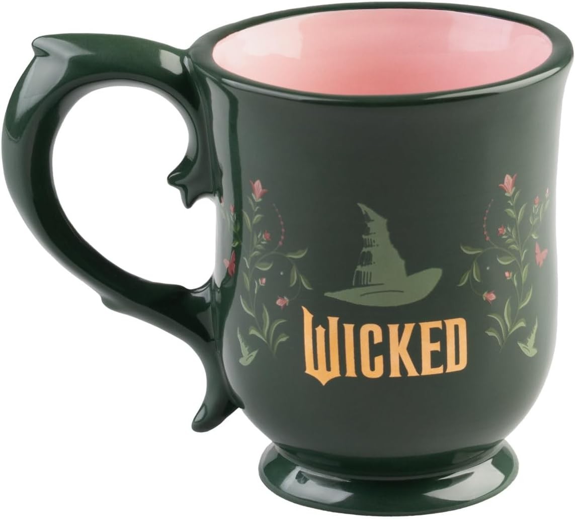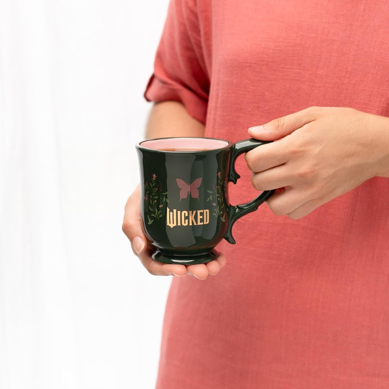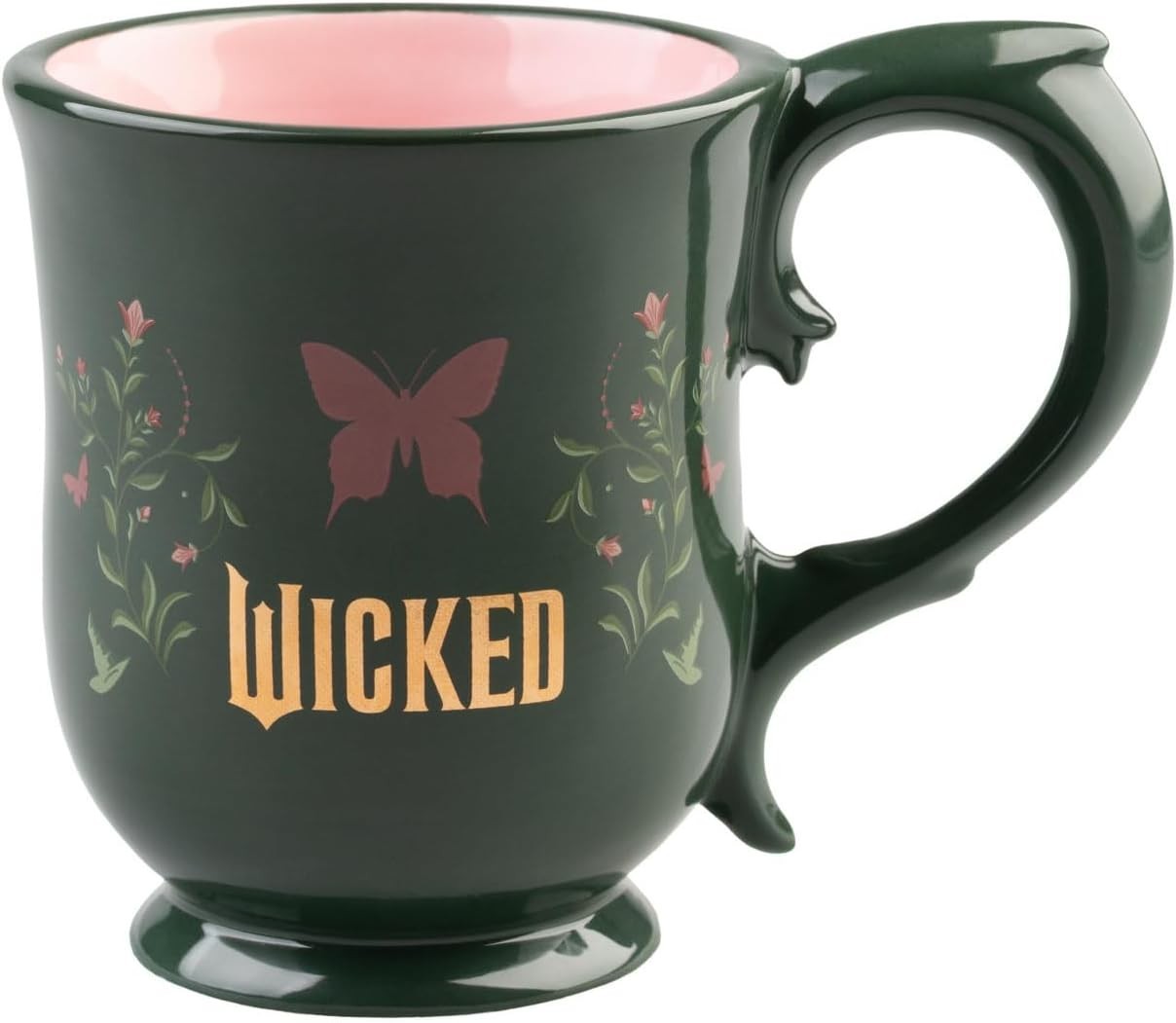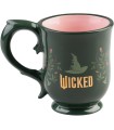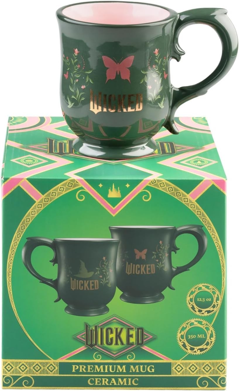 Empieza el día con un toque de magia y personalidad gracias a la Taza Premium Wicked II de cerámica de 350 ml, una pieza pensada para los verdaderos fans del universo Wicked. Esta taza no solo sirve café, té o chocolate caliente: sirve actitud, fantasía y un guiño constante a una de las historias más queridas del teatro musical. Su diseño combina un elegante color verde en el exterior con un delicado interior en rosa pálido, creando un contraste visual sorprendente y muy especial. En la superficie destaca una mariposa que representa a Glinda, símbolo de ligereza y encanto, junto al inconfundible sombrero de Elphaba, evocando su fuerza, rebeldía y carácter único. Cada detalle está pensado para que, al sostenerla entre las manos, sientas que formas parte de Oz. Fabricada en cerámica, es ideal para disfrutar de tus bebidas favoritas con calma. Eso sí, para conservar intactos sus colores y decoración, no es adecuada para lavavajillas ni microondas, lo que la convierte en una taza para cuidar y apreciar como se merece. Perfecta para tus mañanas, para una pausa especial o para regalar a alguien que viva Wicked con pasión. Hazla tuya y deja que cada sorbo cuente una historia mágica.