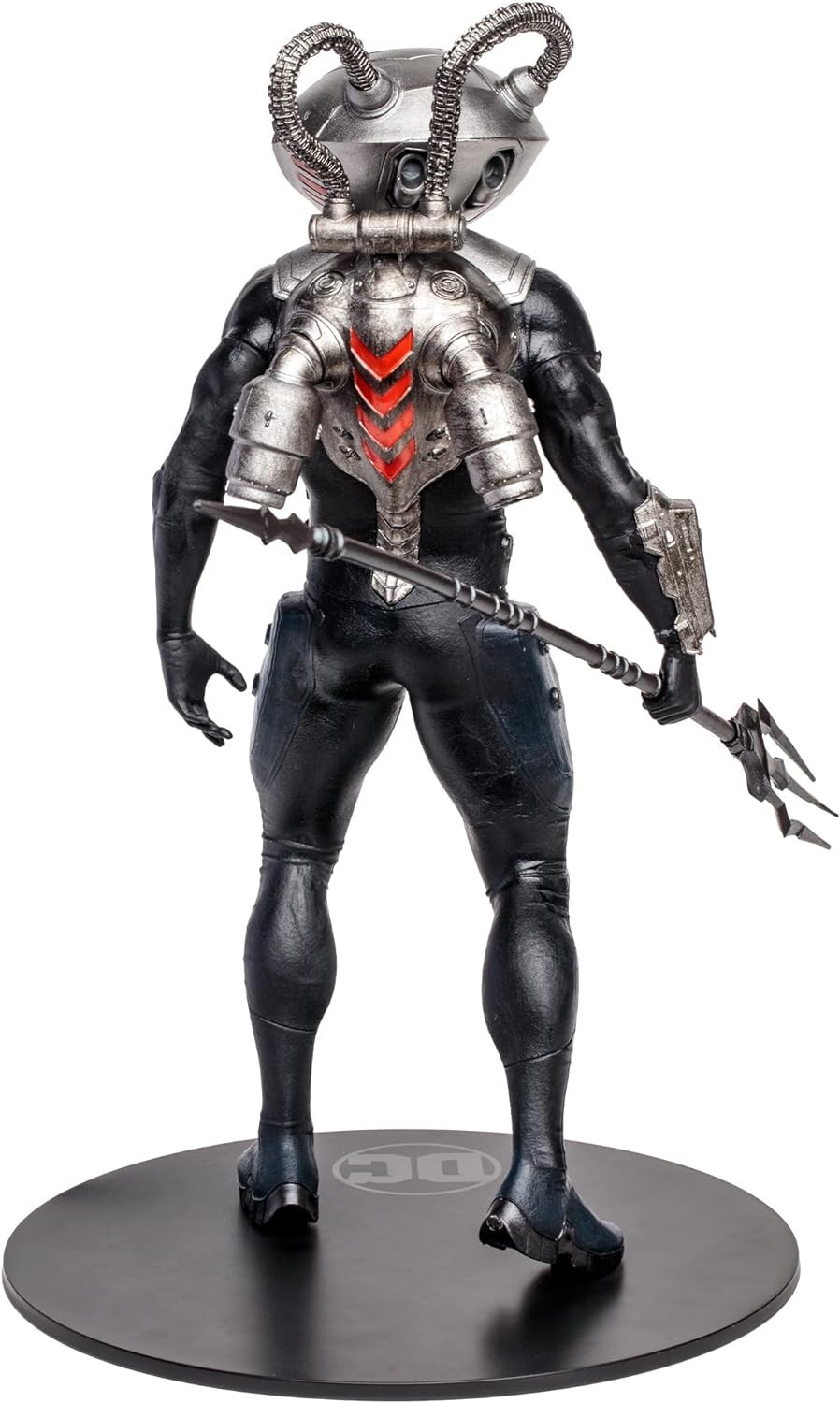 Desde las profundidades de Atlantis llega Black Manta, el villano del superhéroe Aquaman, interpretado por Jason Momoa. Esta figura de 30 cms de Black Manta es una megafig de la marca McFarlane y su línea DC Multiverse. Viene en una caja con ventana de exposición e incluye tridente negro, peana de exposición y tarjeta coleccionable. El nivel de detalle de esta figura rivaliza con el detalle que Black Manta pone a cada una de las máquinas que sus mercenarios fabrican para acabar con Aquaman.