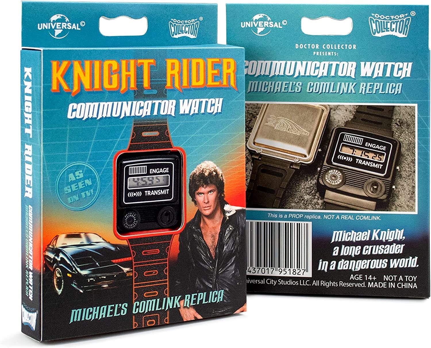 ¿Te sabes la musiquita de “El Coche Fantástico”? Seguro que sí. Si quieres hacer feliz a David Hasselhoff allá donde esté (probablemente California), llévate la espectacular réplica deL Comlink de Michael Knight. El icónico reloj comunicador de Michael de licencia oficial de Universal ha sido creado por Doctor Collector, la prestigiosa marca especializada en réplicas de los objetos más originales del cine y la televisión. Viene en una sensacional caja temática con ilustraciones y fotos de la serie y con una tapa que puedes abrir y ver las características del reloj: hora con seis dígitos, formato de 12h y 24h, función cronógrafo con cuenta separada 1/100. Además, en la parte trasera viene grabado el logo de Knight Industries. ¡Lleva en tu muñeca cada día tu pasión por esta fantástica serie que marcó época y llama a KITT! (No es un intercomunicador real).