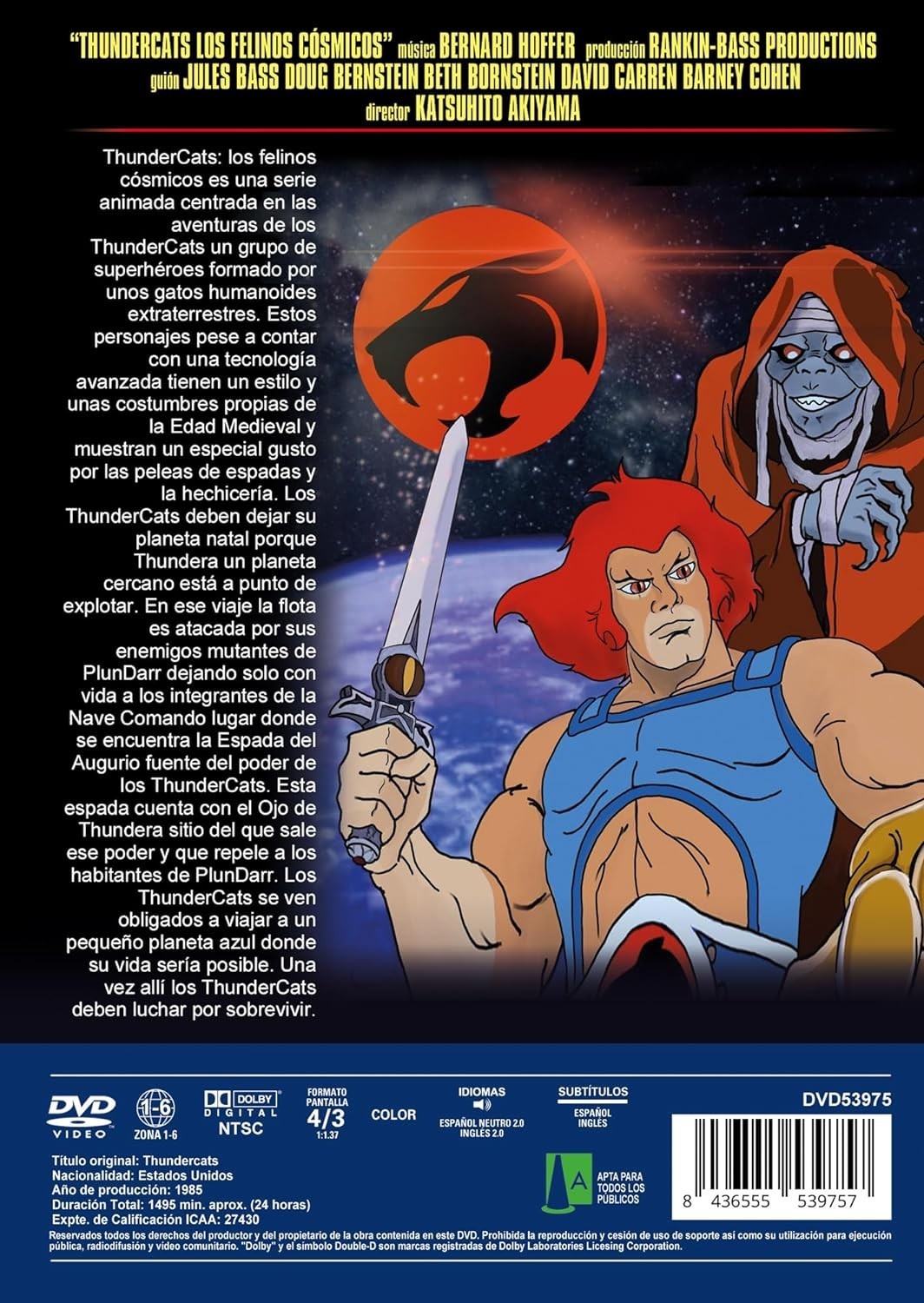 Serie de TV (1985-1989). Los ThunderCats (Felinos Cósmicos) son personajes mitad humanos y mitad felinos. Ellos huyen de su natal Thundera porque el planeta estaba a punto de estallar, en su nave espacial se colocan en una especie de cápsulas donde no envejecerían el único que no entró en ellas fue Jaga el líder. Malignos seres atacan la nave dañándola severamente. Antes de morir Jaga logra llevar a la nave al Tercer Planeta en donde los felinos estarían a salvo...AUDIOS Español Neutro e Inglés (Dolby Digital 2.0) SUBTITULOS Castellano, Inglés, Francés