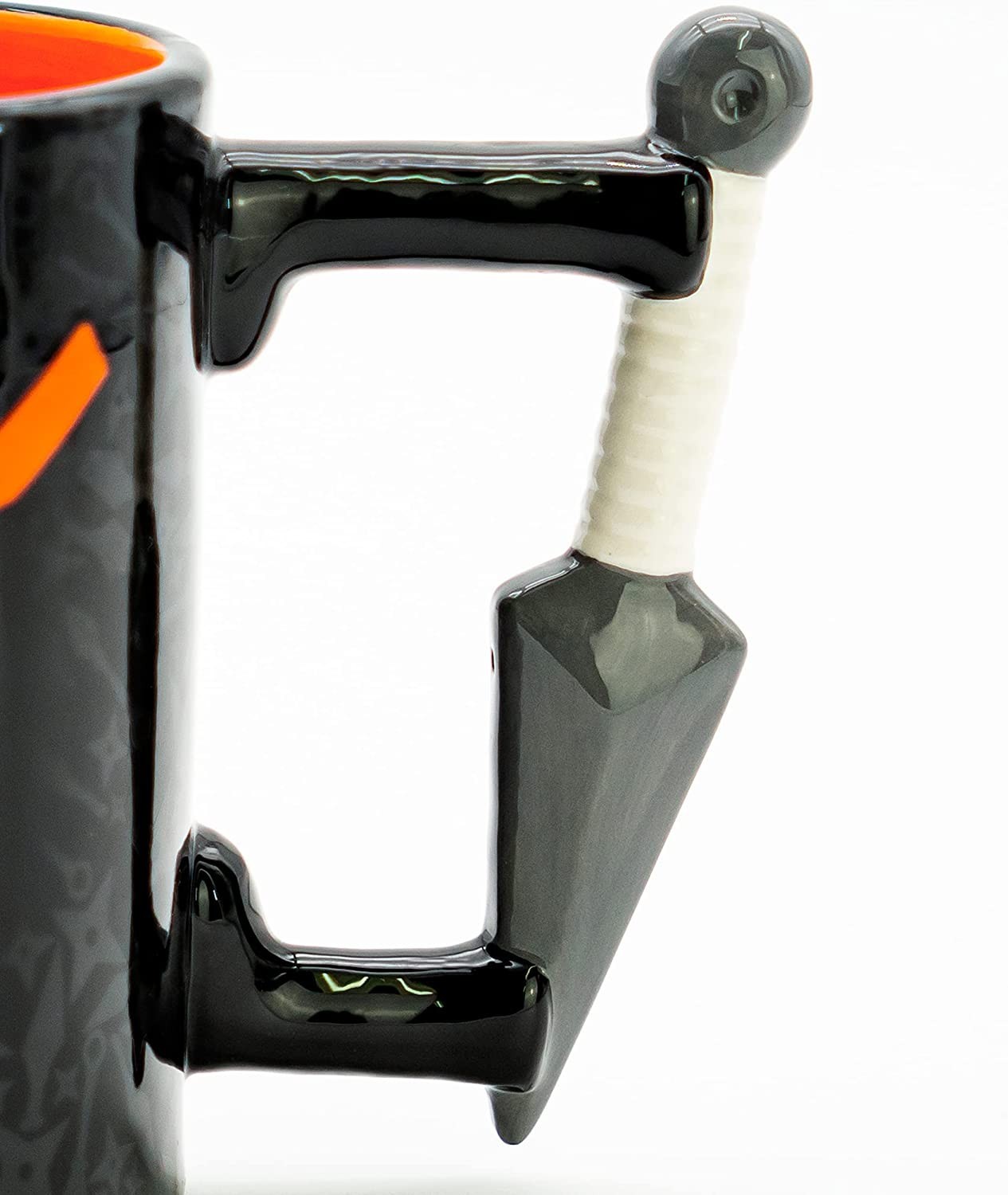 Naruto Shippuden es la serie de manga y anime que cuenta las aventuras del joven Naruto, ninja que tiene en su interior al Zorro de Nueve Colas. Abystyle te trae la espectacular taza 3D que tiene un mango que parece una de las armas arrojadizas de Naruto. Además, es de color negro y naranja y tiene el símbolo del Kunai Konoha en su superficie. Viene en una caja transparente de exposición y tiene una capacidad de nada menos que 500 mls. Está hecha de cerámica de gran calidad y no es apta para lavavajillas ni microondas. Iníciate en el camino del ninja y coge fuerzas cada mañana para tan duro destino con esta fantástica taza que parece salida del anime creado por Masashi Kishimoto.