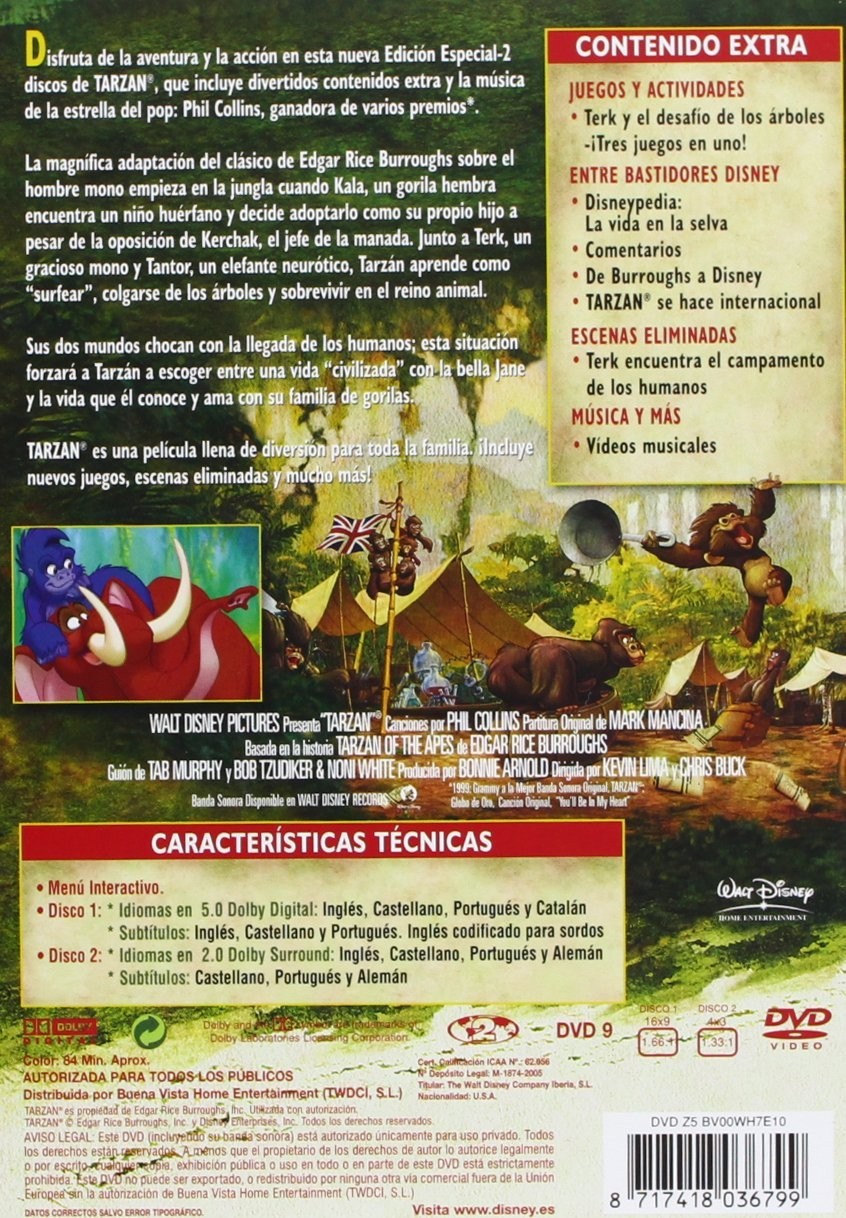 Disfruta de la aventura y la acción en está nueva Edición Especial-2 discos de TARZAN, que incluye divertidos contenidos extra y la música de la estrella del pop: Phil Collins, ganadora de varios premios. La magnifica adaptación del clásico de Edgar Rice Burroughs sobre el hombre mono empieza en la jungla cuando Kala, un gorila hembra encuentra un niño huérfano y decide adoptarlo como su propio hijo a pesar de la oposición de Kerchak, el jefe de la manada. Junto a Terk, un gracioso mono y Tantor, un elefante neurótico, Tarzan aprende como "surfear", colgarse de los árboles y sobrevivir en el reino animal. Sus dos mundos chocan con la llegada de los humanos; esta situación forzará a Tarzan a escoger entre una vida "civilizada" con la bella Jane y la vida que él conoce y ama con su familia de gorilas. Tarzan es una película llena de diversión para toda la familia, incluye nuevos juegos, escenas eliminadas y mucho más!