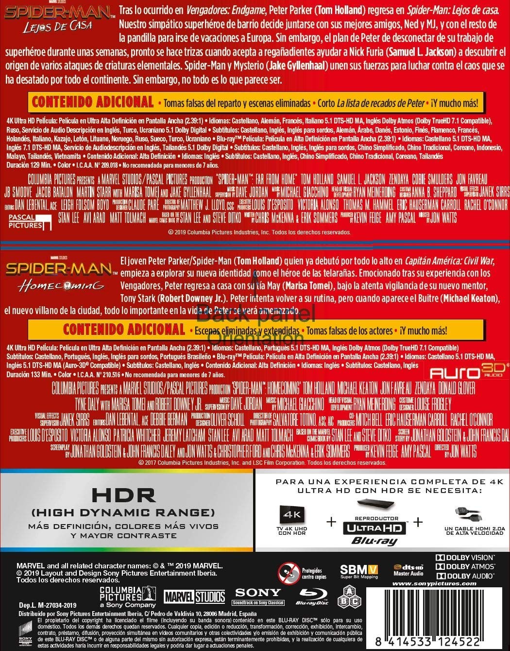 Descripción del producto Tomas falsas del reparto y escenas eliminadas ; Muy muy lejos de casa; ¡Y mucho más. Escenas eliminadas y extendidas; Tomas falsas de los actores; ¡Y mucho más. Sinopsis Spider-man: Lejos de casa: Tras lo ocurrido en Vengadores: Endgame, Peter Parker (Tom Holland) regresa en Spider-Man: Lejos de casa. Nuestro simpático superhéroe de barrio decide juntarse con sus mejores amigos, Ned y MJ, y con el resto de la pandilla para irse de vacaciones a Europa. Sin embargo, el plan de Peter de desconectar de su trabajo de superhéroe durante unas semanas, pronto se hace trizas cuando acepta a regañadientes ayudar a Nick Furia (Samuel L. Jackson) a descubrir el misterio de varios ataques de criaturas elementales. Spider-Man y Mysterio (Jake Gyllenhaal) unen sus fuerzas para luchar contra el caos que se ha desatado por todo el continente. Sin embargo, no todo es lo que parece ser; Spider-man: Homecoming: El joven Peter Parker/Spider-Man (Tom Holland) quien ya debutó por todo lo alto en Capitán América: Civil War, empieza a explorar su nueva identidad como el héroe de las telarañas. Emocionado tras su experiencia con los Vengadores, Peter regresa a casa con su tía May (Marisa Tomei), bajo la atenta vigilancia de su nuevo mentor, Tony Stark (Robert Downey Jr.). Peter intenta volver a su rutina, pero cuando aparece el Buitre (Michael Keaton), el nuevo villano de la ciudad, todo lo importante en la vida de Peter se verá amenazado.
