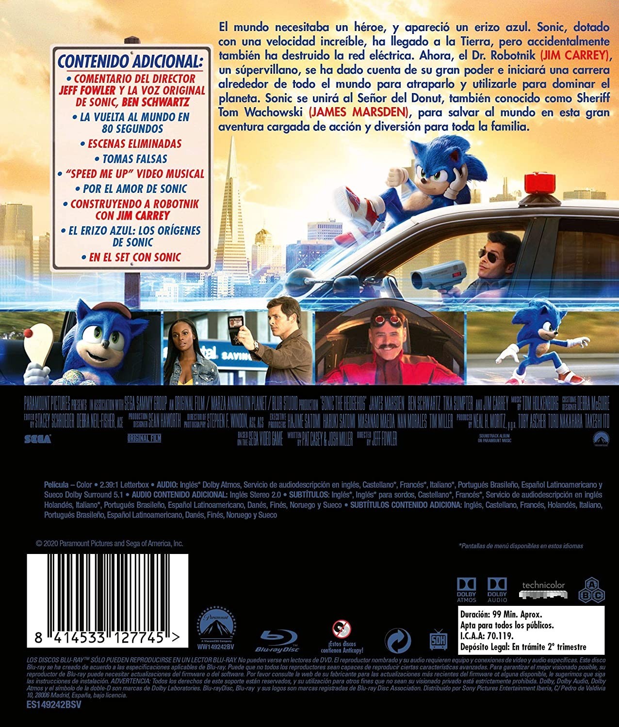Comentario con el director Jeff Fowler y la voz original de Sonic, Ben Schwartz;La vuelta al mundo en 80 segundos;Escenas eliminadas;Tomas falsas;"Speed me up" video musical;Por el amor de Sonic;Construyendo a Robotnik con Jim Carrey;En el set con Sonic;El erizo azul: los orígenes de Sonic