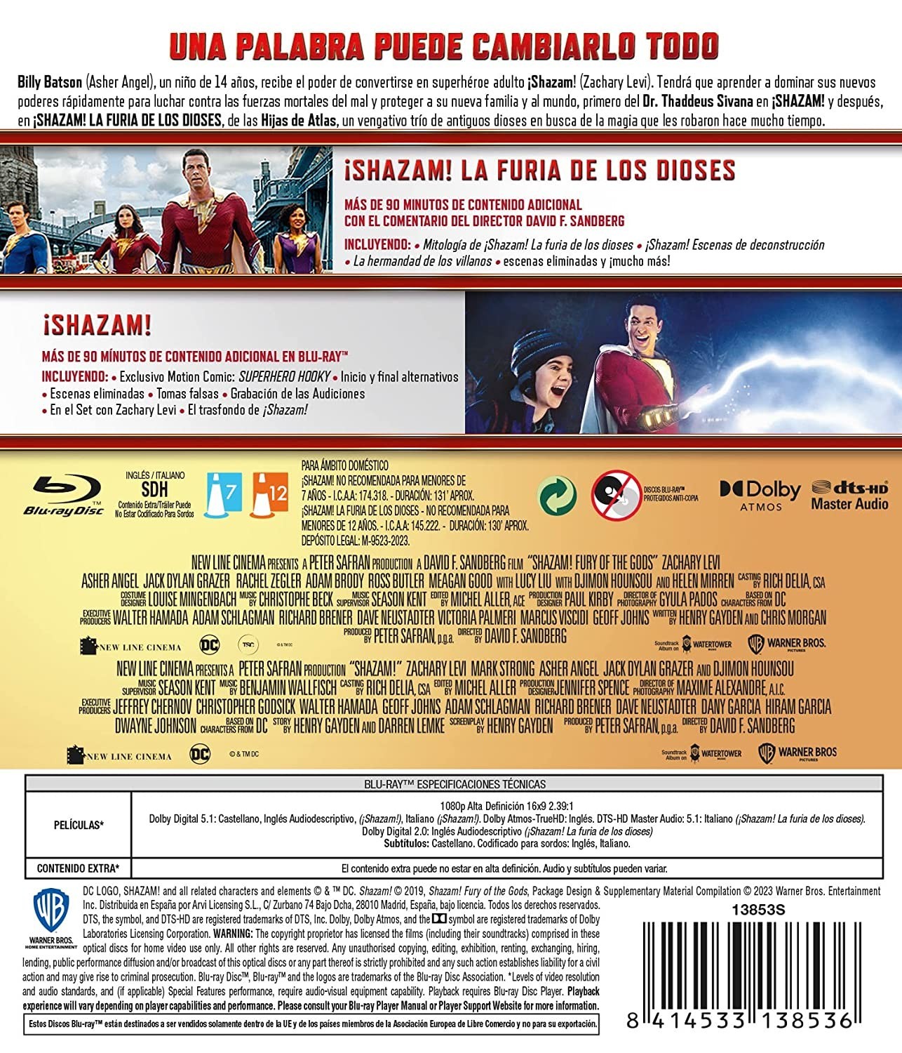 Cuando Billy Batson (Angel), un chaval de acogida de 14 años que ha crecido en las calles, grita la palabra 'SHAZAM!', se convierte en el Superhéroe adulto Shazam (Levi), por cortesía de un antiguo mago. Dentro de un cuerpo musculoso y divino, Shazam esconde un corazón de niño. Pero lo mejor es que en esta versión de adulto consigue realizar todo lo que le gustaría hacer a cualquier adolescente con superpoderes: ¡Divertirse con ellos! ¿Volar? ¿Tener visión de rayos X? ¿Disparar un rayo con las manos? ¿Saltarse el examen de sociales? Shazam va a poner a prueba los límites de sus habilidades con la inconsciencia propia de un niño. Pero necesitará dominar rápidamente esos poderes para luchar contra las letales fuerzas del mal que controla el Dr. Thaddeus Sivana (Strong). ,Billy Batson y sus compañeros adoptados han recibido los poderes de los dioses pero aún están aprendiendo a compaginar sus vidas de adolescentes con sus alter-egos superheróicos. Pero cuando las Hijas de Atlas, un vengativo trío de antiguos dioses, llegan a la Tierra en busca de la magia que les robaron hace mucho tiempo, Billy -alias Shazam- y su familia se ven envueltos en una batalla por sus superpoderes, sus vidas y el destino de su mundo.
