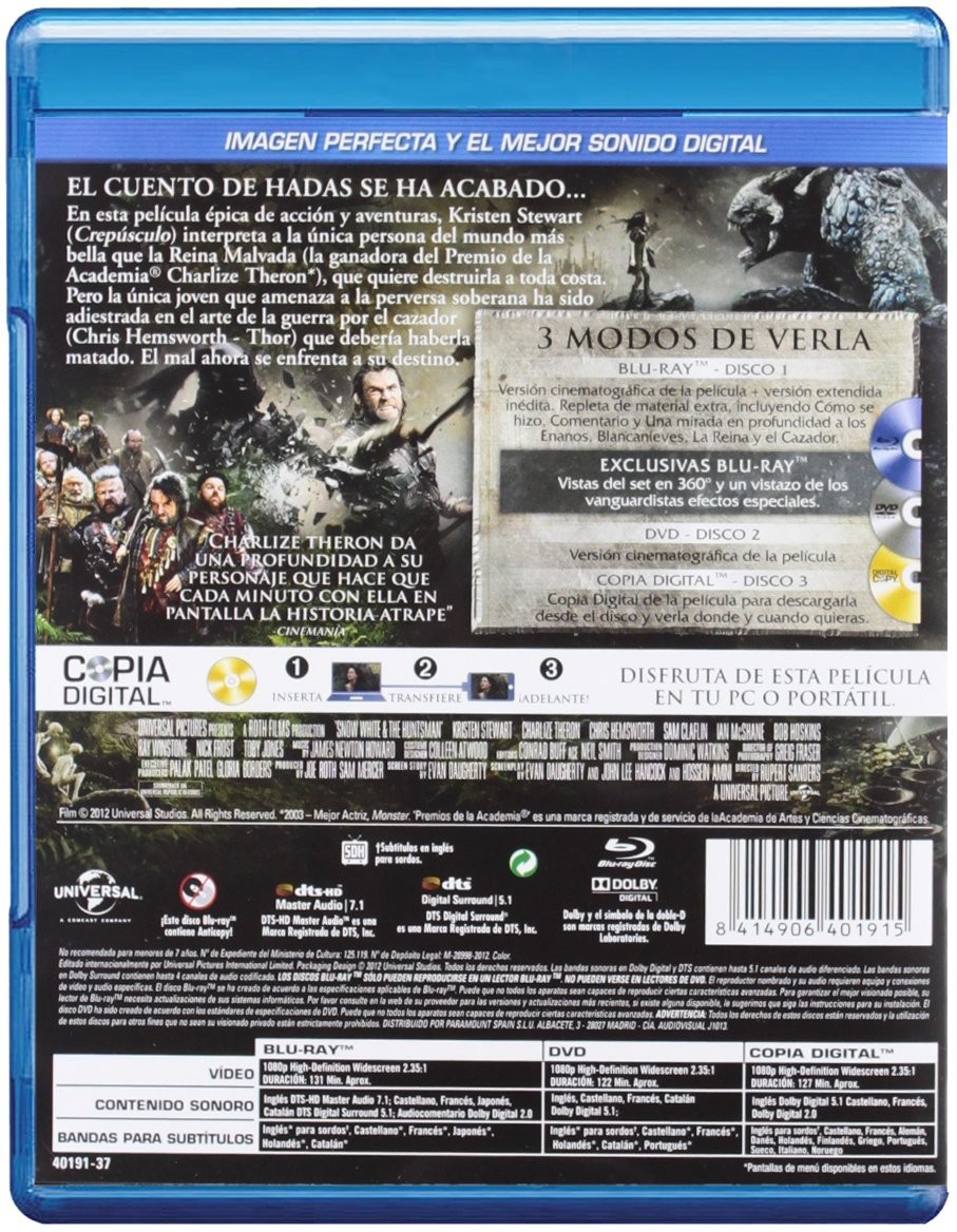 ![Blancanieves y la Leyenda del Cazador [Blu-ray+DVD+Copia Digital] (2012) Snow White and the Huntsman](https://frikiverso.es/664006-large_default/blancanieves-y-la-leyenda-del-cazador-blu-raydvdcopia-digital-2012-snow-white-and-the-huntsman.jpg)