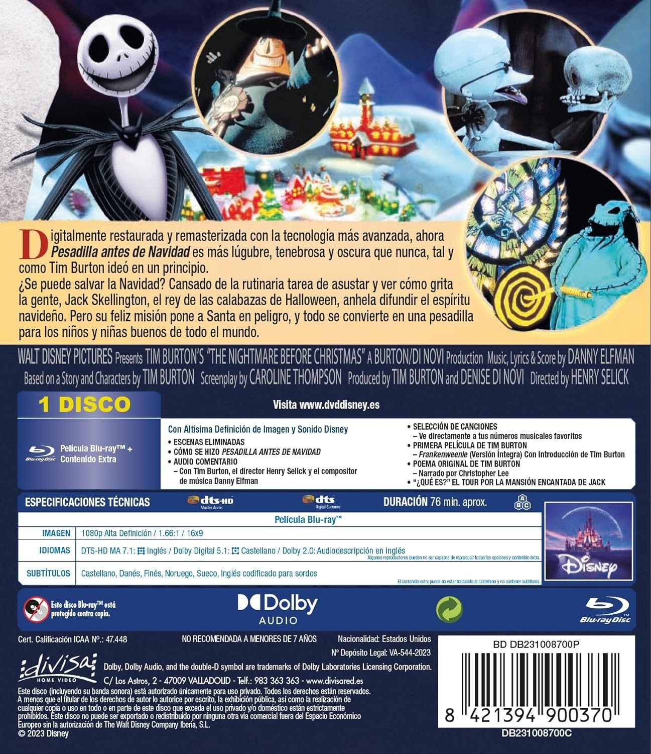 Digitalmente restaurada y remasterizada con la tecnología más avanzada, ahora Pesadilla antes de Navidad es más lúgubre, tenebrosa y oscura que nunca, tal y como Tim Burton ideó en un principio.