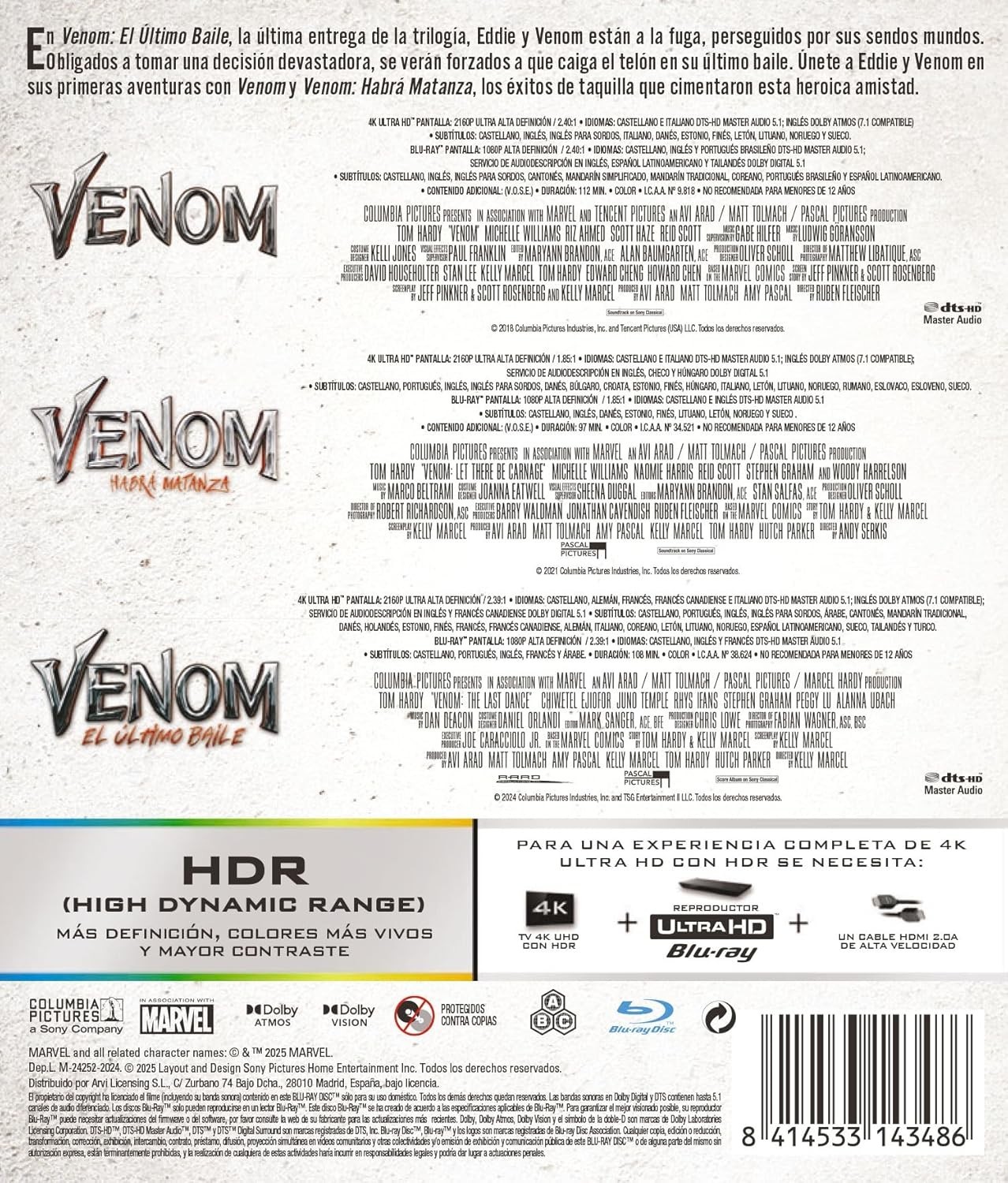 Venom + Venom: Habrá Matanza + Venom: El Último Baile [4K UHD, Blu-ray] (2018,2021,2024) Venom + Venom: Let There Be Carnage + V