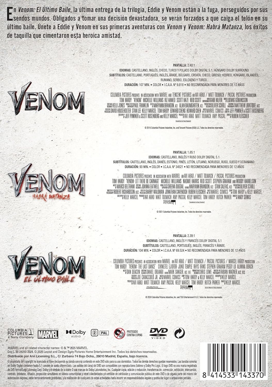 Como periodista, Eddie Brock (Tom Hardy) lleva tiempo intentando desenmascarar al creador de la Fundación Vida, el famoso genio científico Carlton Drake (Riz Ahmed), una obsesión que ha arruinado su carrera y su relación con su novia, Anne (Michelle Williams). Al investigar uno de los experimentos de Drake, el ente alienígena Venom se fusiona con el cuerpo de Eddie, y el reportero adquiere de pronto nuevos e increíbles superpoderes, así como la oportunidad de hacer prácticamente lo que se le antoje. Retorcido, oscuro, impredecible e impulsado por la cólera, Venom obliga a Eddie a luchar por controlar unas habilidades sumamente peligrosas que, al mismo tiempo, también resultan embriagadoras y le hacen sentir poderoso. Dado que Eddie y Venom se necesitan mutuamente para conseguir lo que quieren, se van entremezclando cada vez más... ¿Dónde acaba Eddie y empieza Venom? ,Eddie Brock (Tom Hardy) y su simbionte Venom todavía están intentando descubrir cómo vivir juntos cuando un preso que está en el corredor de la muerte (Woody Harrelson) se infecta con un simbionte propio. ,Eddie y Venom están a la fuga. Perseguidos por sus sendos mundos y cada vez más cercados, el dúo se ve abocado a tomar una decisión devastadora que hará que caiga el telón sobre el último baile de Venom y Eddie.