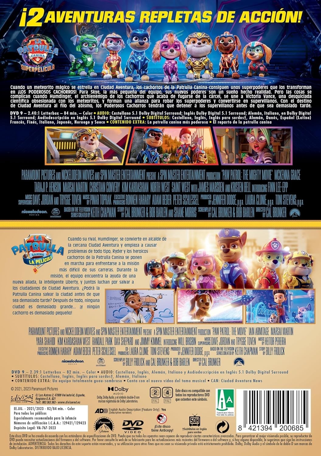 2.40:1 Letterbox – 84 min. – Color • AUDIO: Castellano 5.1 Dolby Digital Surround; Inglés Dolby Digital 5.1 Surround; Alemán, Italiano, en Dolby Digital 5.1 Surround; Audiodescripción en Inglés 5.1 Dolby Digital Surround • SUBTÍTULOS: Castellano, Inglés, Inglés para sordos†, Alemán, Danés, Español (Latino), Francés, Finés, Italiano, Japonés, Noruego y Sueco • CONTENIDO EXTRA: La patrulla canina más poderosa • El reparto de la patrulla canina.