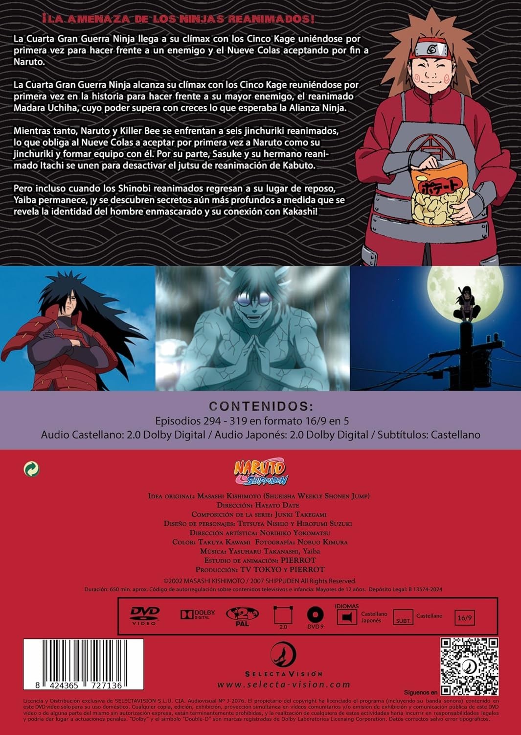 La Cuarta Gran Guerra Ninja llega a su clímax con los Cinco Kage uniéndose por primera vez para hacer frente a un enemigo y el Nueve Colas aceptando por fin a Naruto. La Cuarta Gran Guerra Ninja alcanza su clímax con los Cinco Kage reuniéndose por primera vez en la historia para hacer frente a su mayor enemigo, el reanimado Madara Uchiha, cuyo poder supera con creces lo que esperaba la Alianza Ninja. Mientras tanto, Naruto y Killer Bee se enfrentan a seis jinchuriki reanimados, lo que obliga al Nueve Colas a aceptar por primera vez a Naruto como su jinchuriki y formar equipo con él. Por su parte, Sasuke y su hermano reanimado Itachi se unen para desactivar el jutsu de reanimación de Kabuto. Pero incluso cuando los Shinobi reanimados regresan a su lugar de reposo, Madara permanece, ¡y se descubren secretos aún más profundos a medida que se revela la identidad del hombre enmascarado y su conexión con Kakashi!