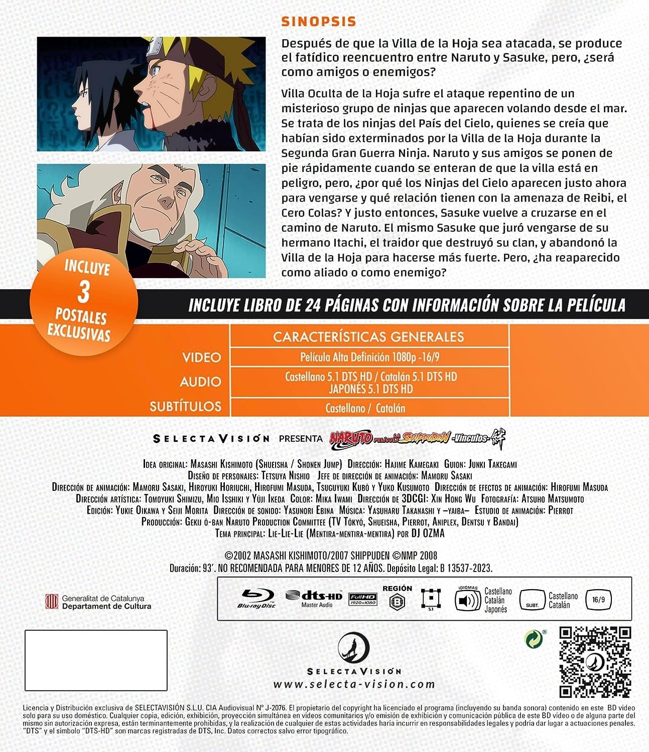 Después de que la Villa de la Hoja sea atacada, se produce el fatídico reencuentro entre Naruto y Sasuke, pero, ¿será como amigos o enemigos? La Villa Oculta de la Hoja sufre el ataque repentino de un misterioso grupo de ninjas que aparecen volando desde el mar. Se trata de los ninjas del País del Cielo, quienes se creía que habían sido exterminados por la Villa de la Hoja durante la Segunda Gran Guerra Ninja. Naruto y sus amigos se ponen de pie rápidamente cuando se enteran de que la villa está en peligro, pero, ¿por qué los Ninjas del Cielo aparecen justo ahora para vengarse y qué relación tienen con la amenaza de Reibi, el Cero Colas? Y justo entonces, Sasuke vuelve a cruzarse en el camino de Naruto. El mismo Sasuke que juró vengarse de su hermano Itachi, el traidor que destruyó su clan, y abandonó la Villa de la Hoja para hacerse más fuerte. Pero, ¿ha reaparecido como aliado o como enemigo?