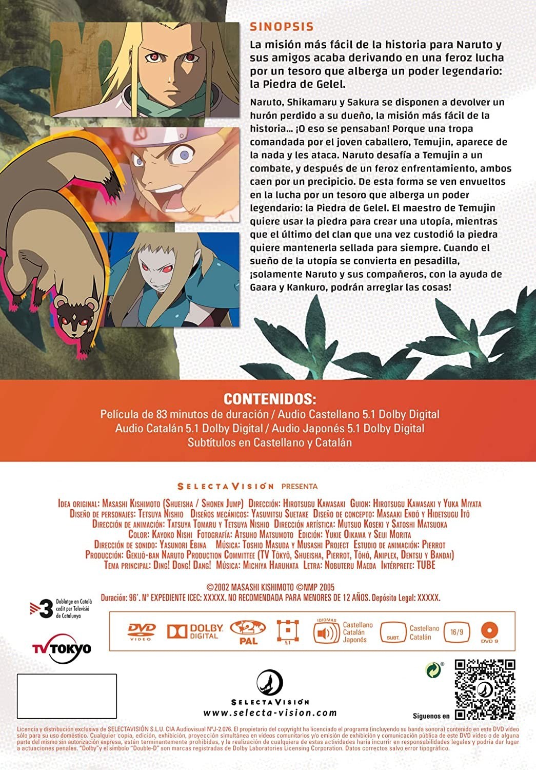 La misión más fácil de la historia para Naruto y sus amigos acaba derivando en una feroz lucha por un tesoro que alberga un poder legendario: la Piedra de Gelel. Naruto, Shikamaru y Sakura se disponen a devolver un hurón perdido a su dueño, la misión más fácil de la historia… ¡O eso se pensaban! Porque una tropa comandada por el joven caballero, Temujin, aparece de la nada y les ataca. Naruto desafía a Temujin a un combate, y después de un feroz enfrentamiento, ambos caen por un precipicio. De esta forma se ven envueltos en la lucha por un tesoro que alberga un poder legendario: la Piedra de Gelel. El maestro de Temujin quiere usar la piedra para crear una utopía, mientras que el último del clan que una vez custodió la piedra quiere mantenerla sellada para siempre. Cuando el sueño de la utopía se convierta en pesadilla, ¡solamente Naruto y sus compañeros, con la ayuda de Gaara y Kankuro, podrán arreglar las cosas!