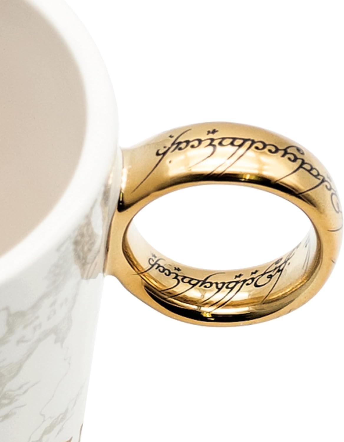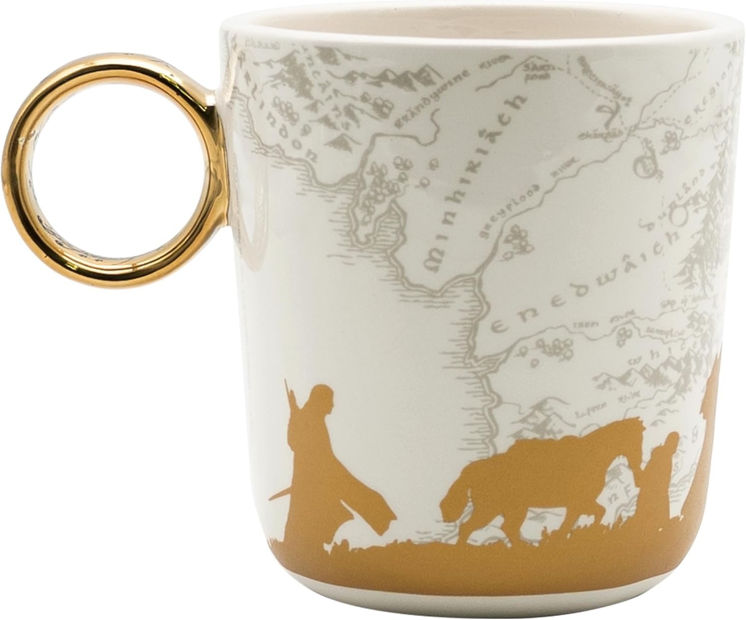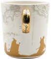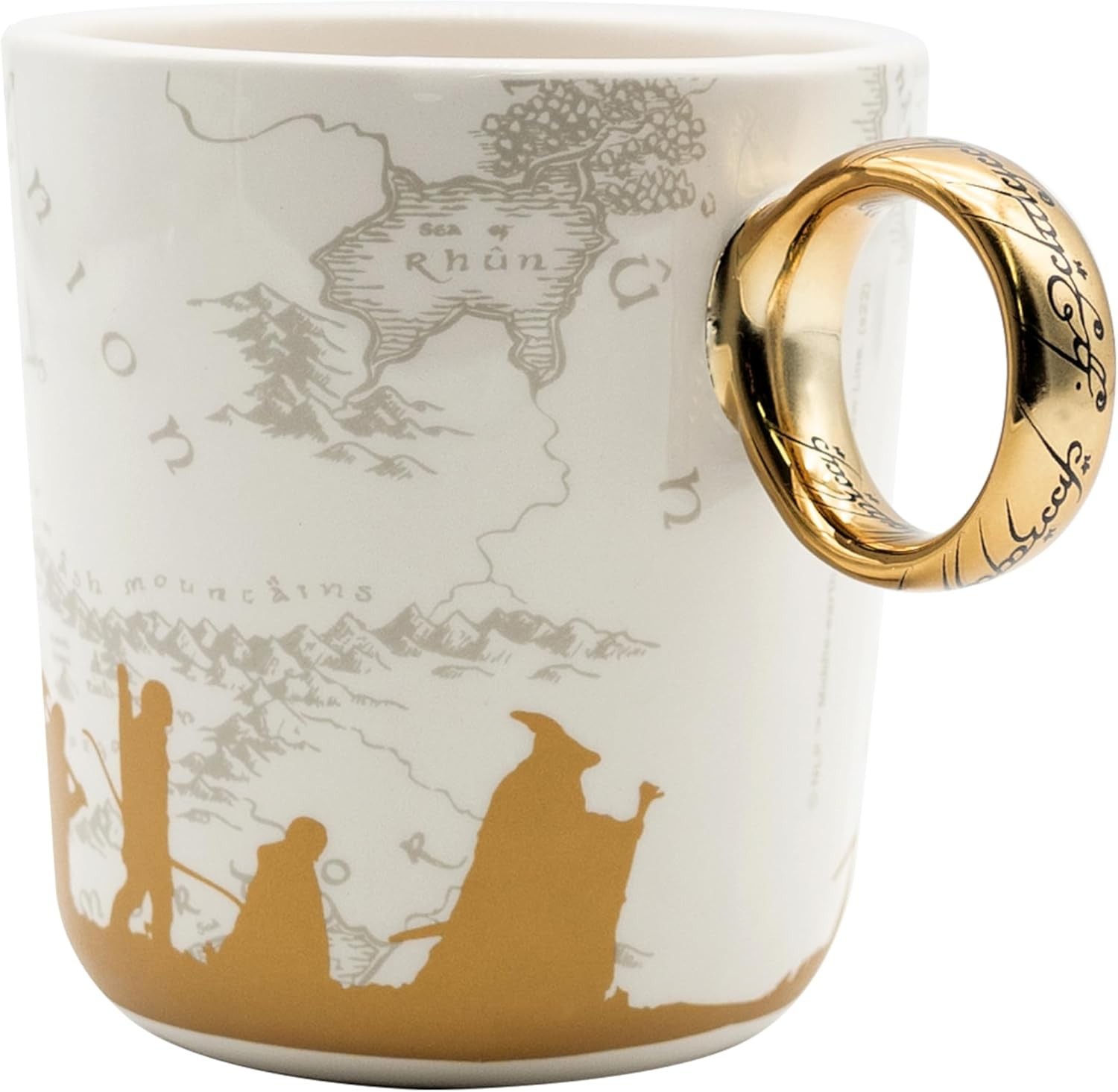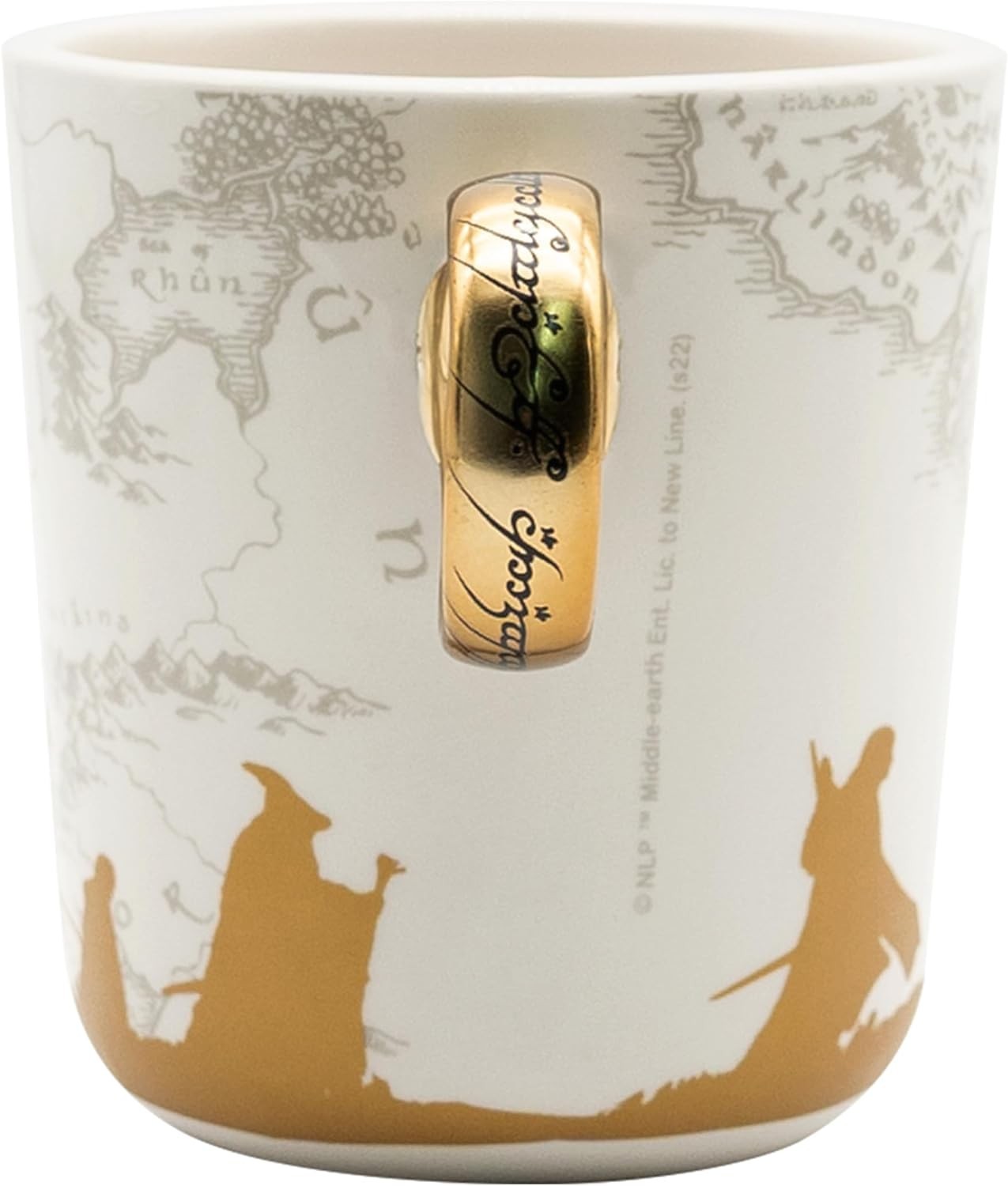 Una taza para gobernarlos a todos y atarlos en las tinieblas… No, no es exactamente eso lo que dice la novela de J.R.R. Tolkien, pero es lo que tu dirás después de beber tu leche de desayuno en esta increíble taza de El Señor de los Anillos. Se trata de una taza con asa 3D que recrea el Anillo Único con su acabad dorado y sus inscripciones en lengua oscura. La taza tiene elegantes ilustraciones de las siluetas de la comunidad del anillo sobre un mapa de la Tierra Media. Es una creación de licencia oficial de la marca Abystyle. Tiene una capacidad de 460 mls, y no es apta para lavavajillas ni microondas.
